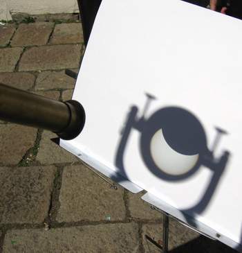 E' stato anche invitato il prof. G. Griffon dell'I.T.I.S. Fermi con la classe 5A, che si è reso disponibile a montare e a mettere a disposizione il suo telescopio moderno dotato del prisma aggiuntivo a 45º. Una felice iniziativa che ha permesso l'ossevazione continuativa dell'eclissi (cosa non fattibile con il vecchio strumento per questioni di sicurezza) e la ripartizione degli studenti in più gruppi (due per l'osservazione e uno per i richiami teorici sul fenomeno). Come fatto per il transito di Venere, è stato allestito un piccolo punto informativo a schede curato dal prof. Paolo Bonavoglia e utilizzato di volta in volta dai vari docenti per dare agli studenti le necessarie informazioni sul fenomeno celeste in atto prima di procedere con la sua osservazione. Il prof. Paolo Bonavoglia è anche autore della sequenza di fotografie sull'eclissi (ottenta con l'impiego di mezzi moderni), che va ad arricchire la sezione Eclissi e Calendari del sito internet del Liceo Foscarini.