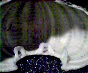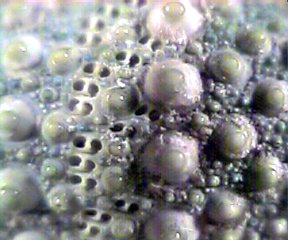 La forma rotonda nasconde a prima vista le differenze fra le parti della corazza; osservando con attenzione, però, si riconoscono le dieci doppie file di pori, che a due a due delimitano le cinque aree ambulacrali, e le cinque fasce interabulacrali, interposte alle prime, che portano solo le protuberanze di base per gli aculei. A sinistra, un dettaglio della superficie. Si nota la disposizione dei pori, su ogni coppia dei quali è innestato un pedicello; si vedono inoltre le protuberanze che reggono gli aculei, con l'estremità arrotondata che rende snodato il collegamento. Gli aculei si possono qui distinguere in primari, più grossi e disposti in linea, e secondari, distribuiti in modo meno preciso intorno ai primi.