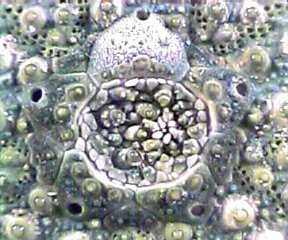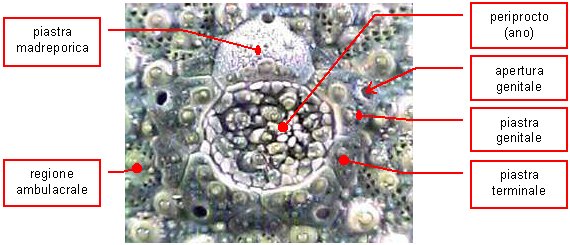 Dettaglio del polo superiore di echinide regolare; è detto anche "polo aborale" in quanto diametralmente opposto alla bocca. Al centro si trova il campo anale, molle. Intorno ad esso si vedono cinque "piastre genitali" di forma pentagonale, ciascuna delle quali mostra un'apertura genitale (gonoporo) che serve a spargere i gameti nell'ambiente. Una di queste piastre costituisce anche il madreporite, cioè la comunicazione tra l'apparato ambulacrale e l'esterno; la si riconosce perché coperta di finissimi pori. Ogni piastra genitale costituisce l'estremità di una zona interambulacrale. Alternate a queste piastre si trovano poi le terminali, triangolari, con cui terminano le zone ambulacrali; di queste zone radiali si distinguono nell'immagine i fori dei pedicelli. Nella realtà la regione rotonda al centro dell'immagine ha un diametro di 5,5 mm.