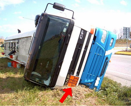 Che cosa trasporta questa autocisterna ribaltata? Senza un'ispezione diretta rispondere sembrerebbe un'impresa impossibile, ma in realtà l'informazione "in codice" è alla portata di un qualsiasi cittadino e per di più restando a una certa distanza dal veicolo. Infatti basta leggere la targa arancione indicata con la freccia nella foto.