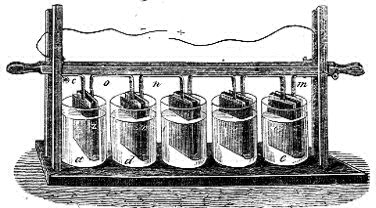 Partendo dalla sinistra della figura, una piccola lamina di rame C è saldata ad una grossa piastra Z di zinco. Questo è il polo negativo della pila ovvero l'anodo della pila. Una seconda lamina di rame, a, grande come quella di zinco, la circonda senza toccarla. Ciò forma la prima coppia o elemento della pila e un simile espediente costruttivo permette di aumentsare la superficie degli elettrodi, assai minore disponendoli solamente uno di fronte all'altro. La lamina di rame è saldata (tramite la linguetta di rame O) ad un seconda lamina di zinco Z' ed essa è nuovamente circondata da una piastra di rame d, formando con essa la seconda coppia. Appare evidente che le piastre di zinco e di rame immerse in una stessa tazza sono unite a lastre differenti ovvero pescanti nel conduttore di seconda classe di una diversa tazza. Il polo positivo corrisponde all'ultimo rame m.